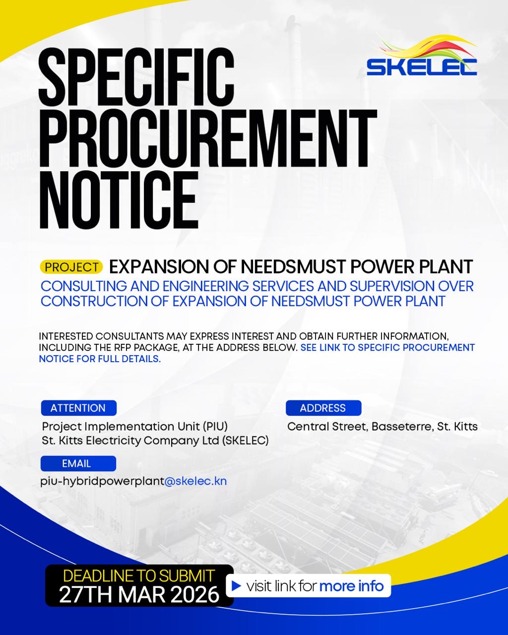 Basseterre, St. Kitts (February 1st, 2026) — The St. Kitts Electricity Company Ltd (SKELEC) announces the launch of an open and competitive tender for engineering consulting services for the Expansion of the Needsmust Power Plant. This project is aimed at bolstering the energy infrastructure of St. Kitts and Nevis by providing a platform to meet the nation’s growing energy demand and to support the country’s sustainable energy future.