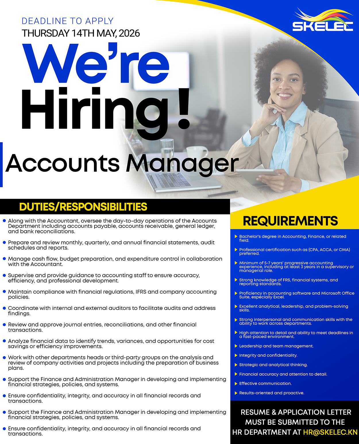 The St. Kitts Electricity Company Ltd. (SKELEC) is inviting suitably qualified and experienced professionals to apply for the position of Accounts Manager. This role is essential to ensuring strong financial governance, accountability, and operational excellence across the organization.